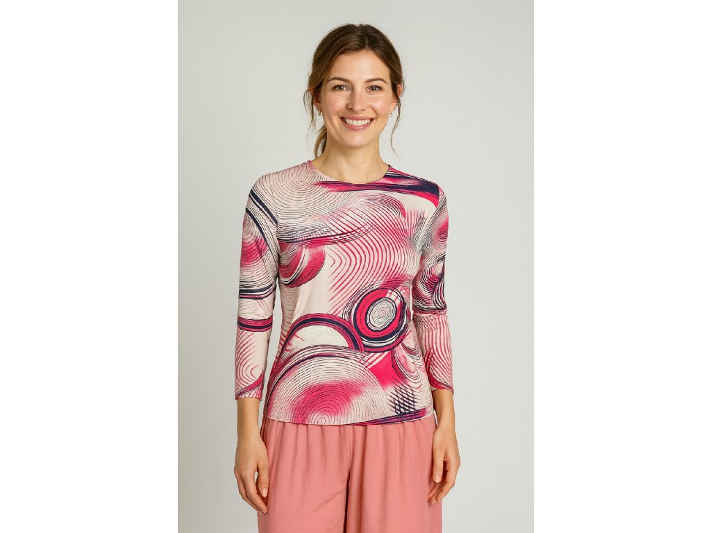 Připravte se zazářit – tato halenka s dlouhým rukávem přitahuje pozornost originálním geometrickým vzorem v odstínech růžové, smetanové a námořnické modré. Díky pohodlnému střihu krásně padne a zvýrazní ženskou siluetu. Kombinujte s jednoduchými kalhotami nebo sukní a nechte vzor vyniknout naplno. Skvělá volba pro ženy, které se nebojí barev a originality.